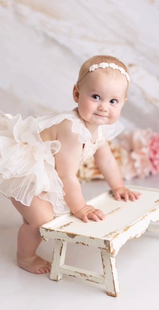 Made with a linen blend fabric in cream. Beautiful pastel pink flowers, with pearl beads and greenery.