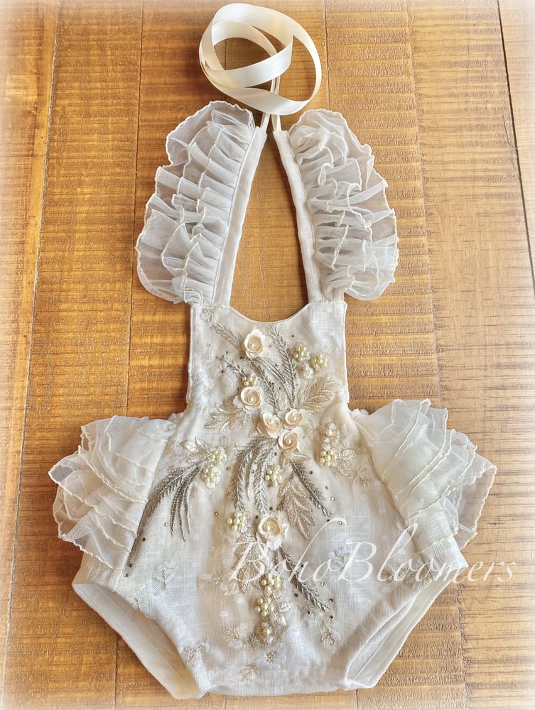 **Made with soft creamy linen blend as the base of fabric. Layered with embroidery floral fabric in gold and white.